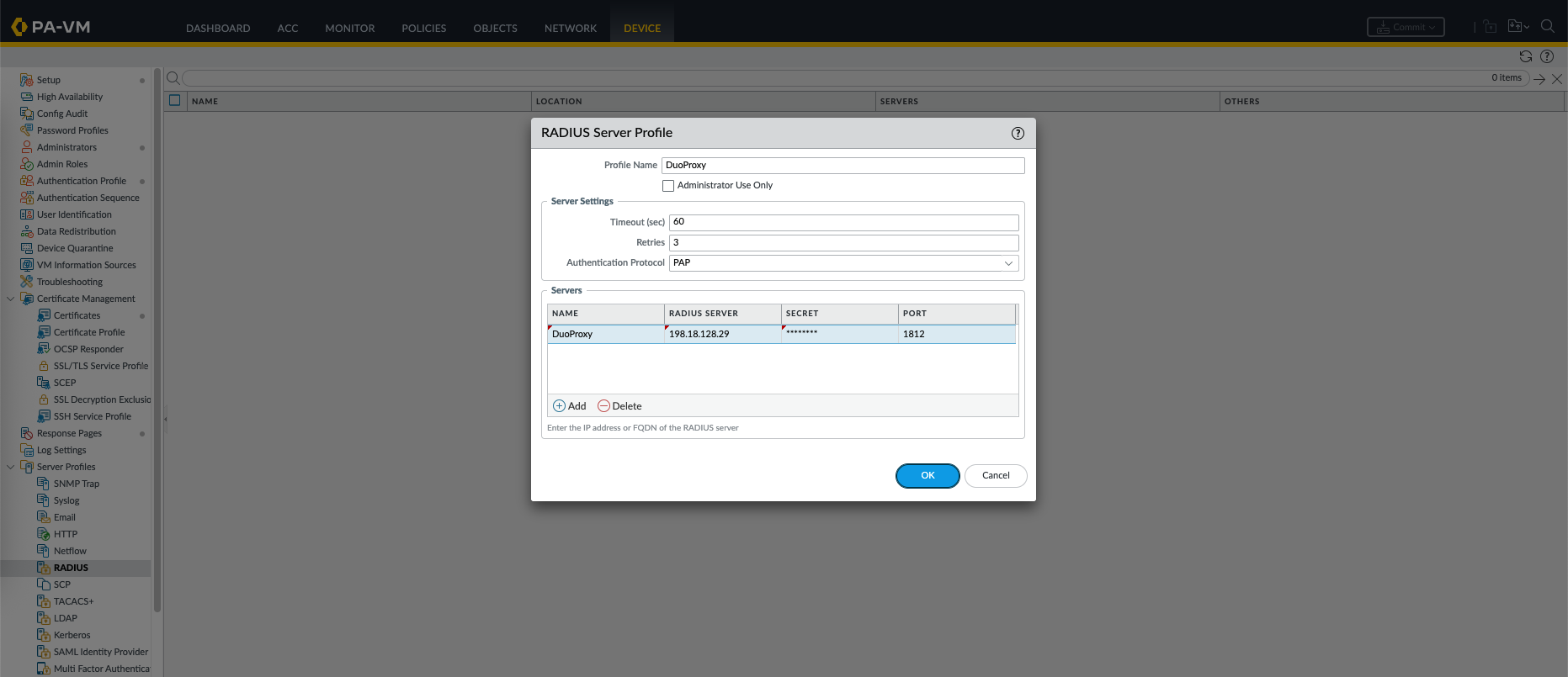 Next on the Palo side, create a new Radius Server Profile pointing to the Duo Proxy