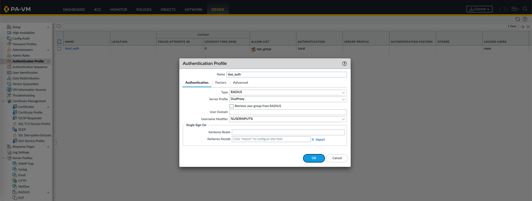 Then create a new Authentication Profile that uses the newly created Duo Proxy Server Profile