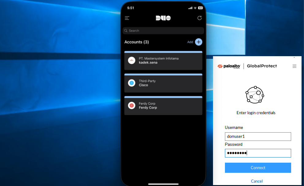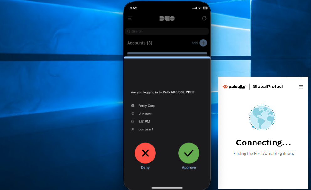 Palo Alto GlobalProtect VPN with Cisco Duo MFA adds a second layer of security to remote access. Users first authenticate with their corporate credentials through GlobalProtect, then Duo provides multi-factor authentication before granting VPN access, ensuring only verified users can connect securely.