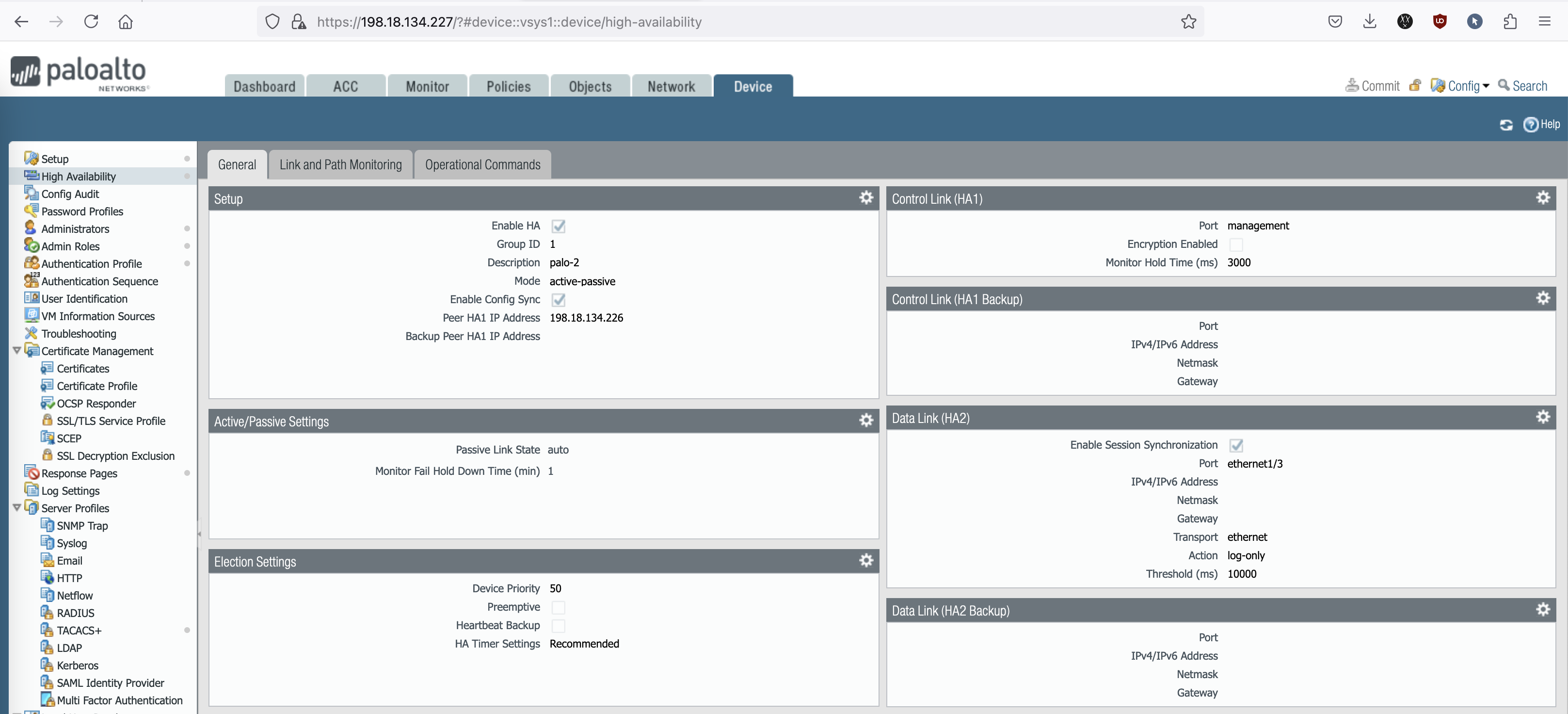 On Palo-1, we configure the HA cluster with the mode of Active-Active, other than that the rest of configurations is pretty much the same as previously