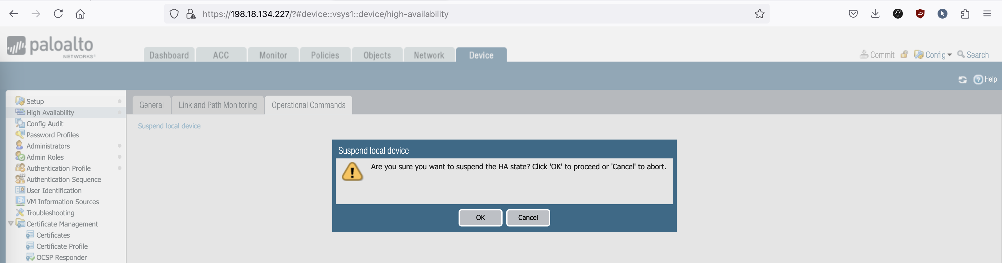 One way to simulate a failure is by suspending the HA operation on Device » High Availability » Operational Commmands