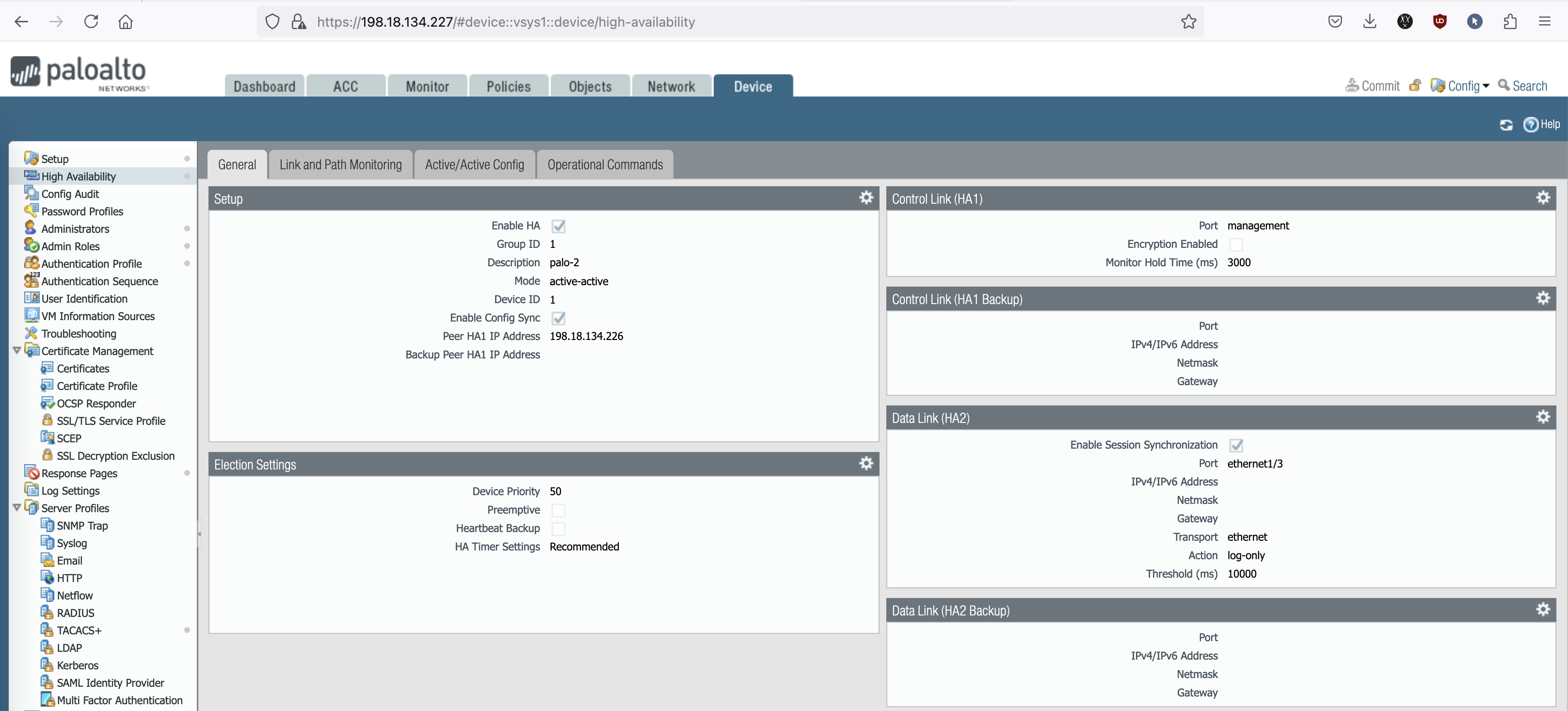 On the Palo-2, we configure pretty much the mirrored configuration with slight differnces in IP Addressing and Device Priority