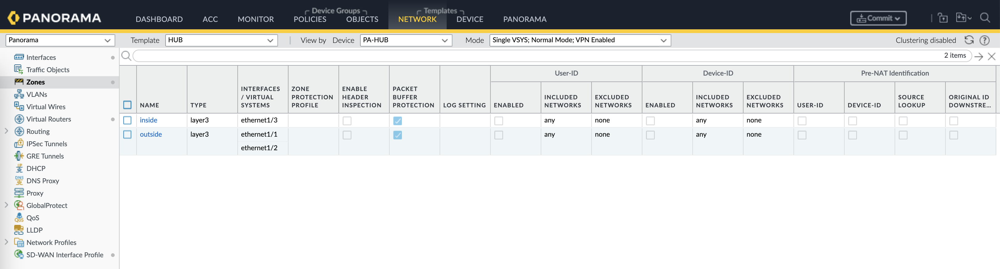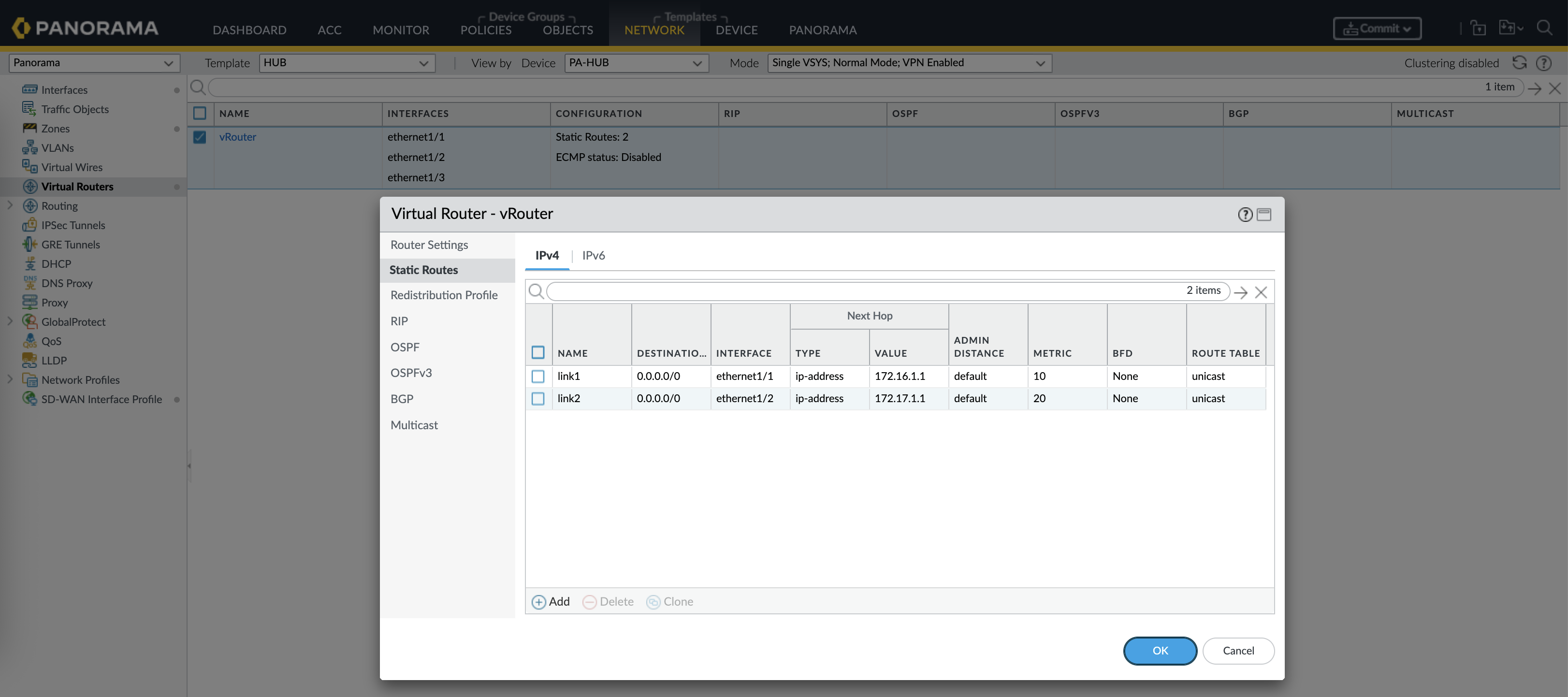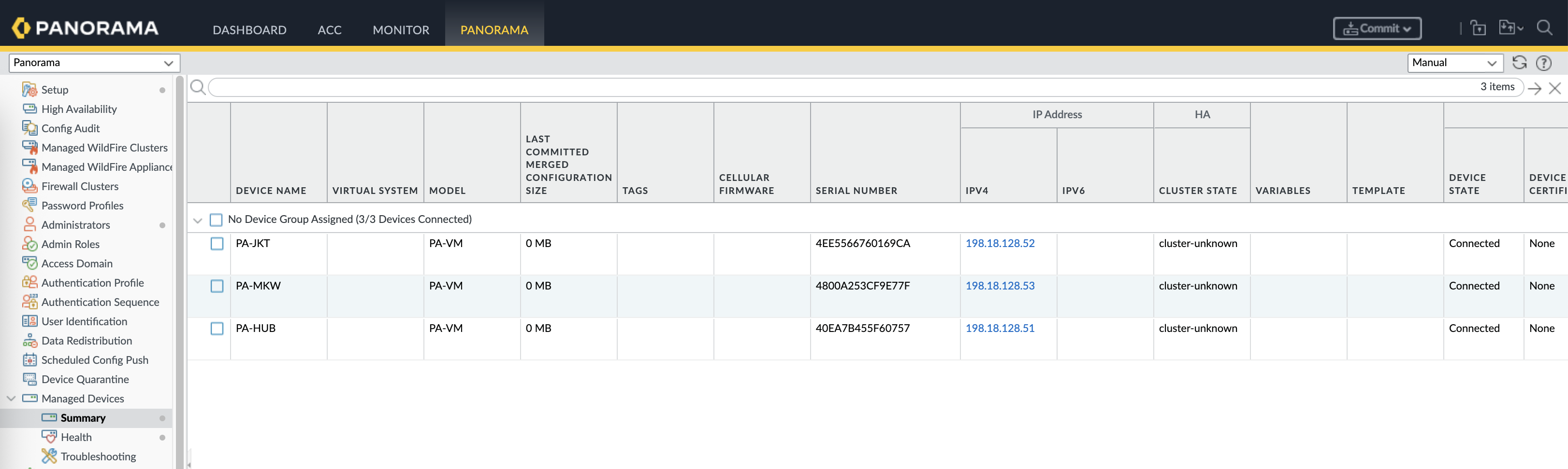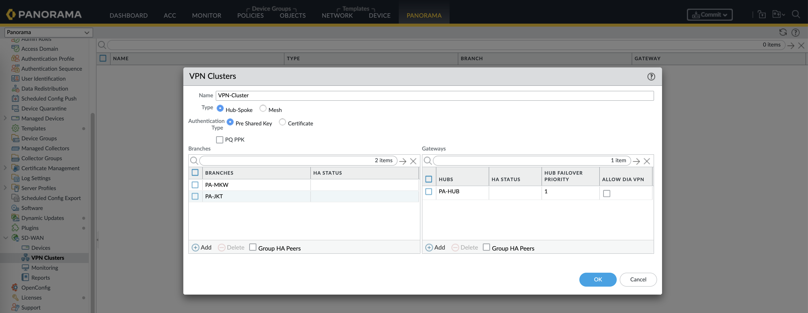 And finally we can create the VPN Cluster with Hub and Spoke type, add all the devices according to their roles and hit commit & push