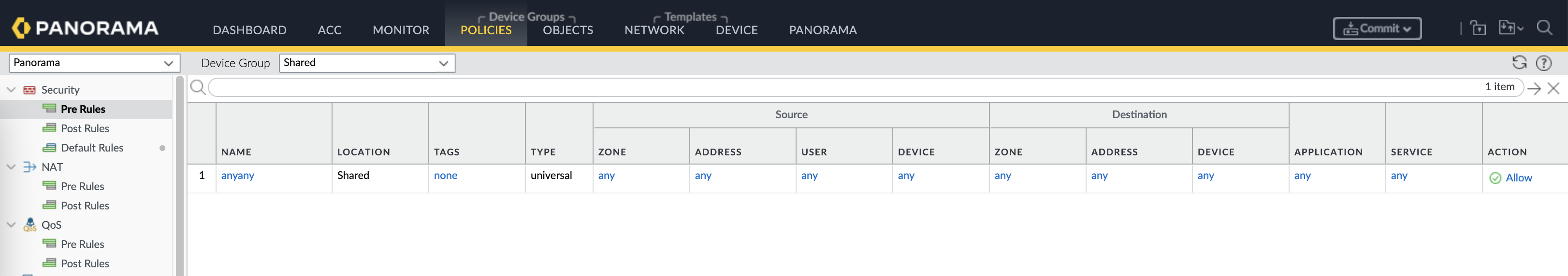 Next we tackle the policies, we will use a shared policy of “any-any” for the sake of simplicity