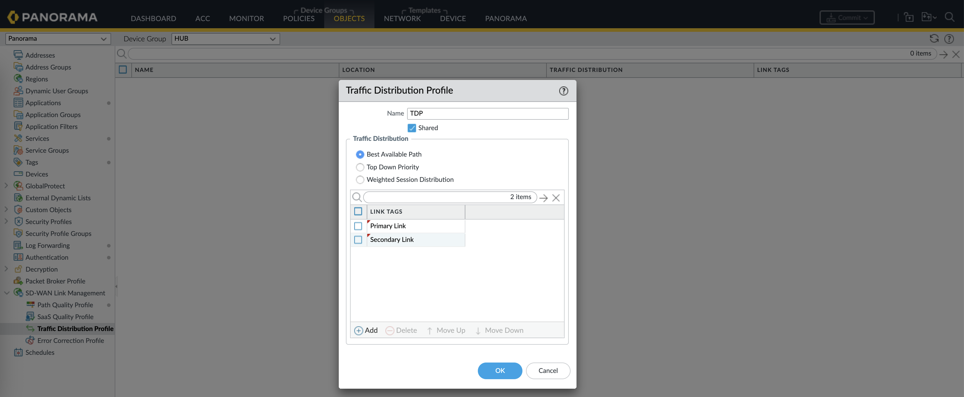Then create a Traffic Distribution Profile for link distribution algorithm, enter the 2 link tags created earlier