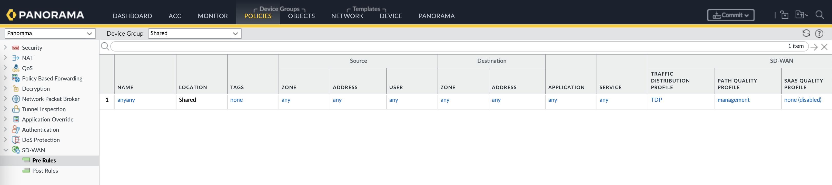 Then create a SD-WAN Policy, we also use “any-any” to ease up the deployment, and refer the TDP here
