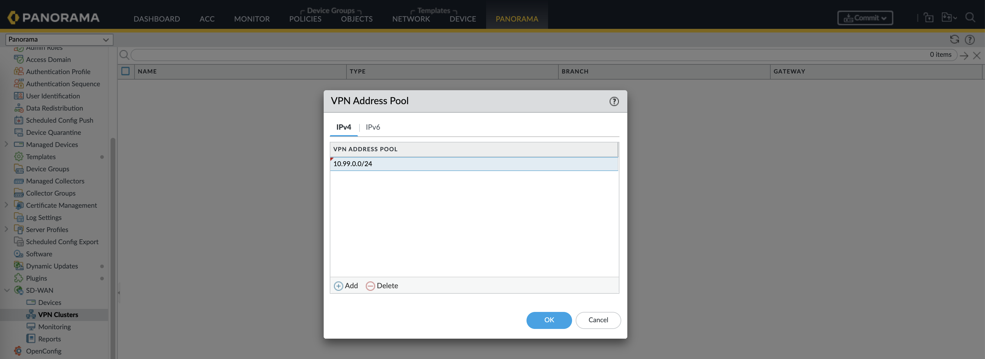 Next on the VPN Clusters, create an VPN Address Pool, this pool will be used dynamically to form up underlay links between hub and spokes