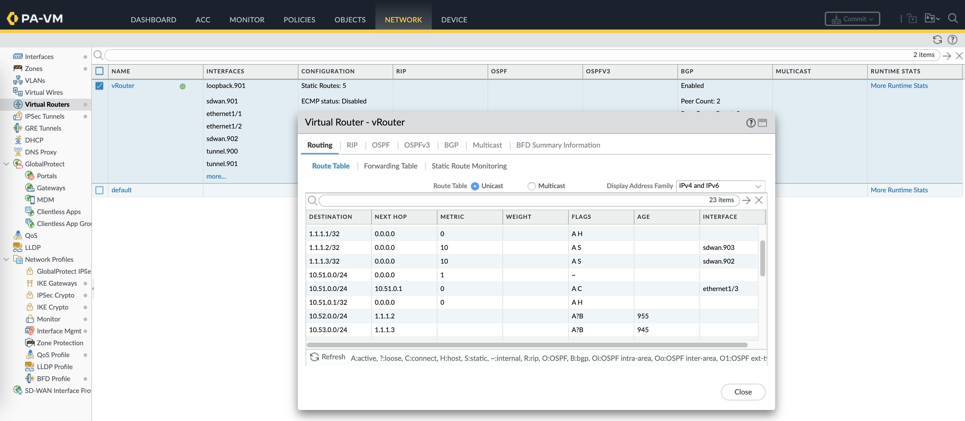 On the vRouter, we can see routing tables to reach the branches with next-hop to the loopback of each firewall advertised through BGP