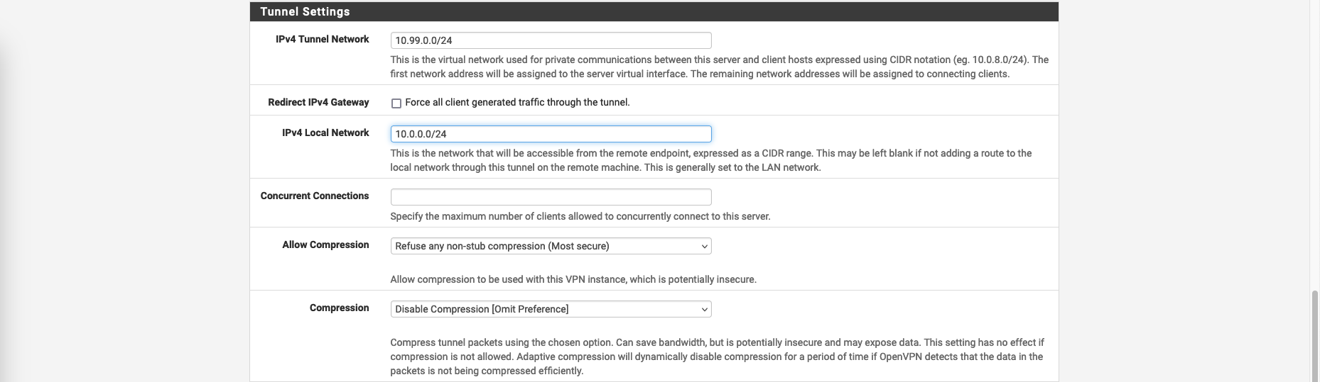 On Tunnel Settings, configure the Tunnel Network for our VPN Clients to use, then declare the internal network to be accessed by VPN users on IPV4 Local Network. Also disable Redirect IPV4 Gateway to enable Split Tunneling