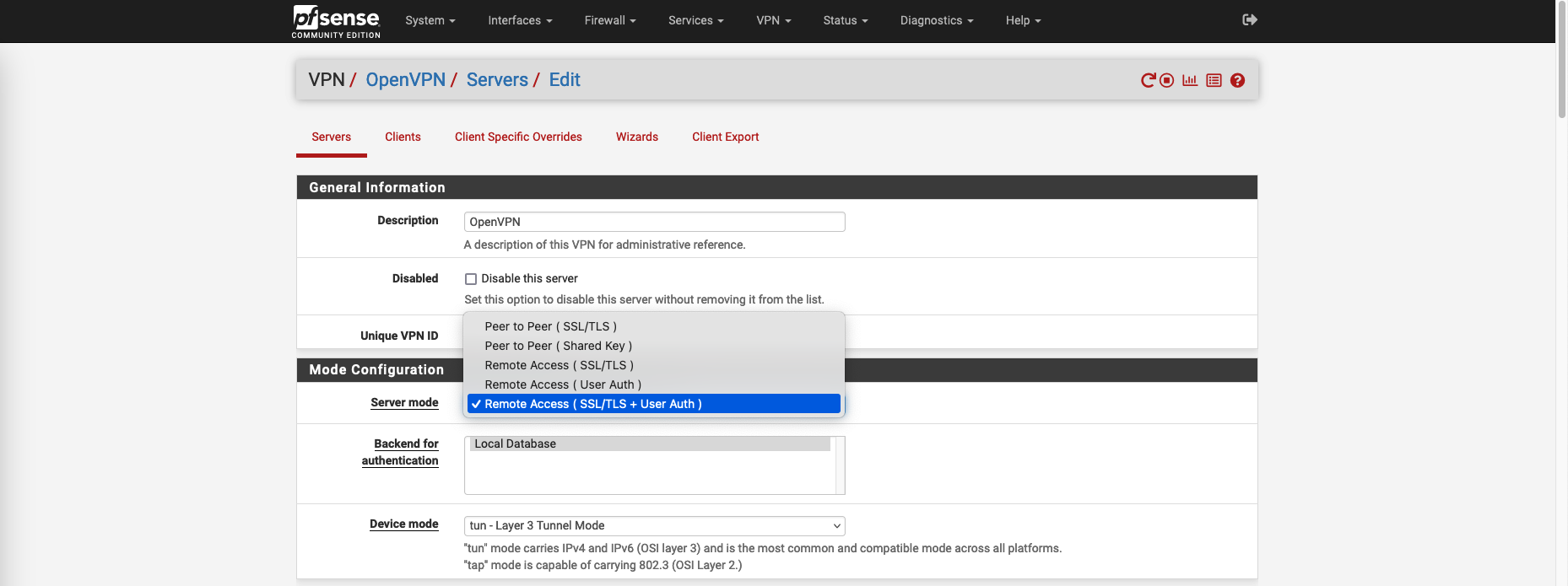 If we edit the VPN, we can see we have multiple server modes, this setting basically dictates how the authentication is done between clients and server. Here we select SSL + User Auth meaning clients will be asked to have both personal user certificate and credentials to connect to the VPN.