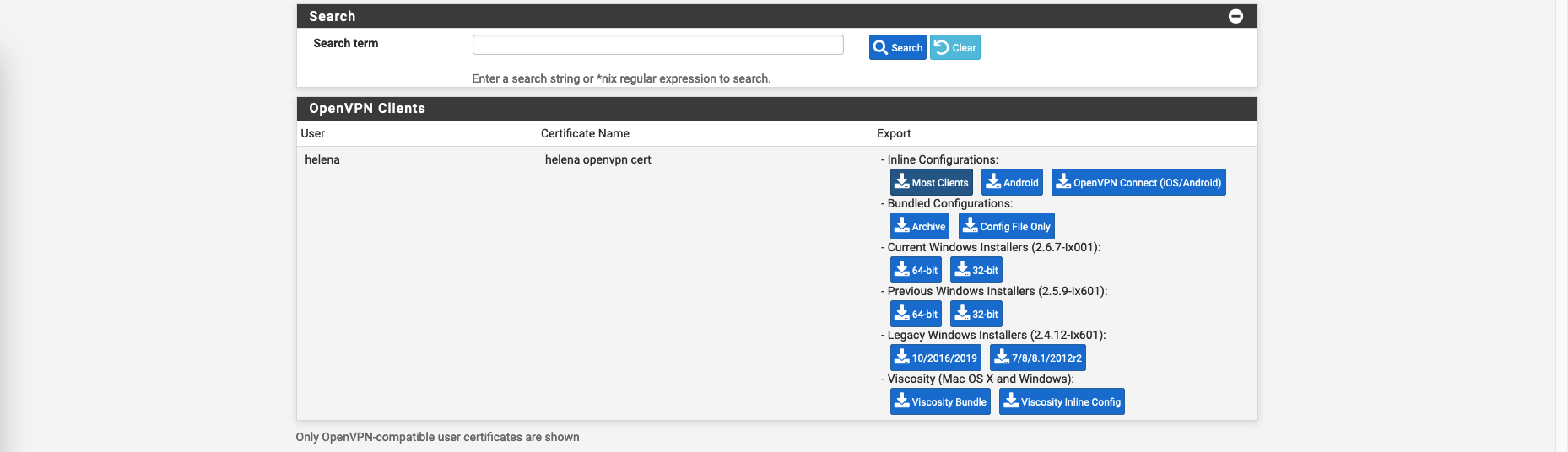 On VPN » OpenVPN » Client Export, download the Inline Configurations and the VPN Client Installers