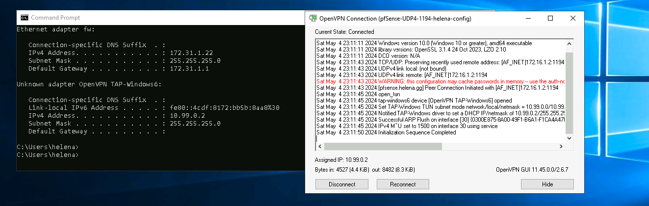 Back on pfSense, on Status » OpenVPN, we can see the user helena is connected