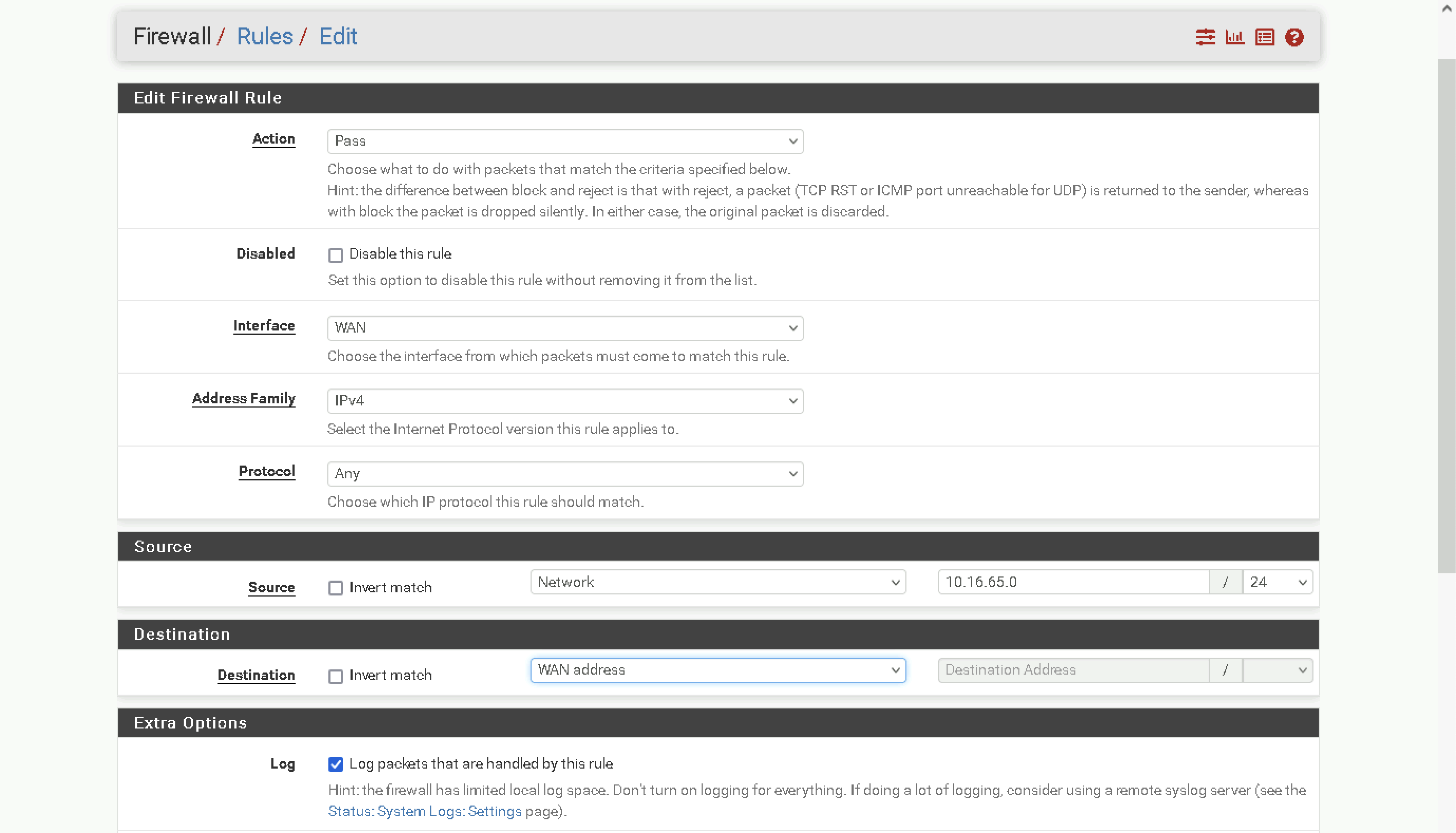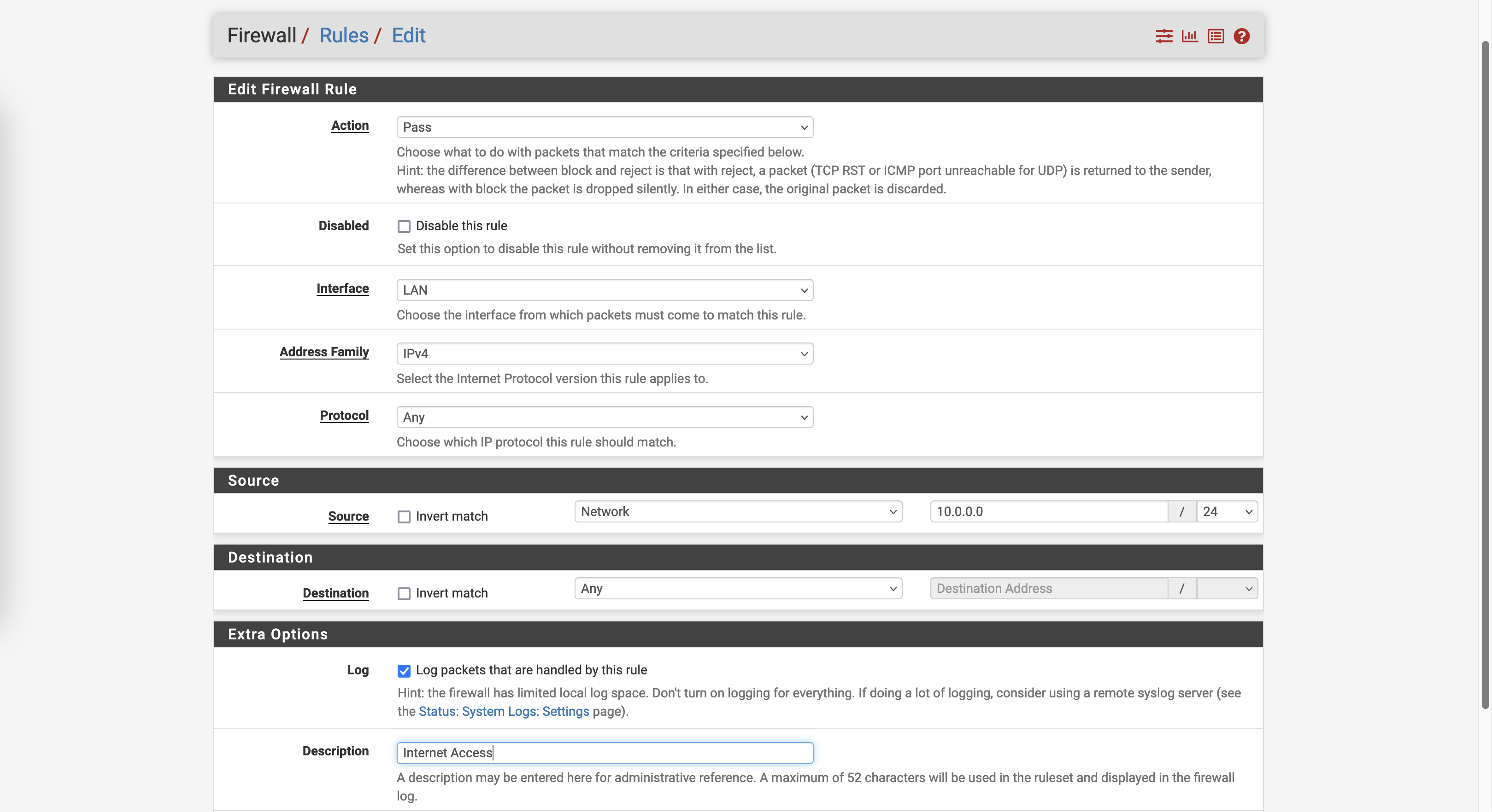 Next create a LAN Firewall Rule to allow traffic coming from 10.0.0.0/24