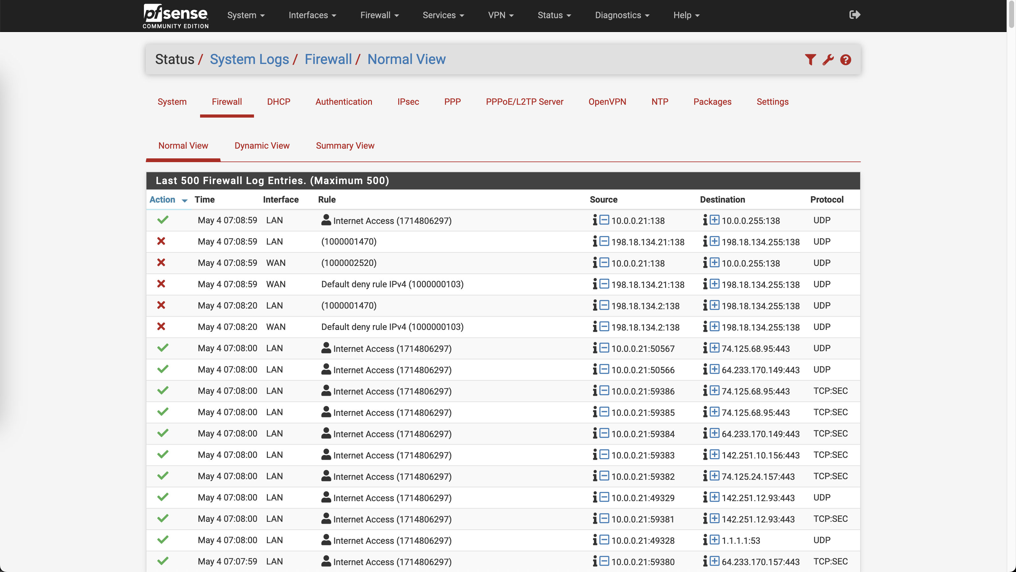 On Status » System Logs » Firewall, we can see the clients traffic flowing through the Internet Access Rule