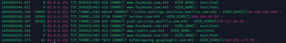 Now lets try blocking traffic to facebook and reddit, on the sqiuid.conf file add these lines