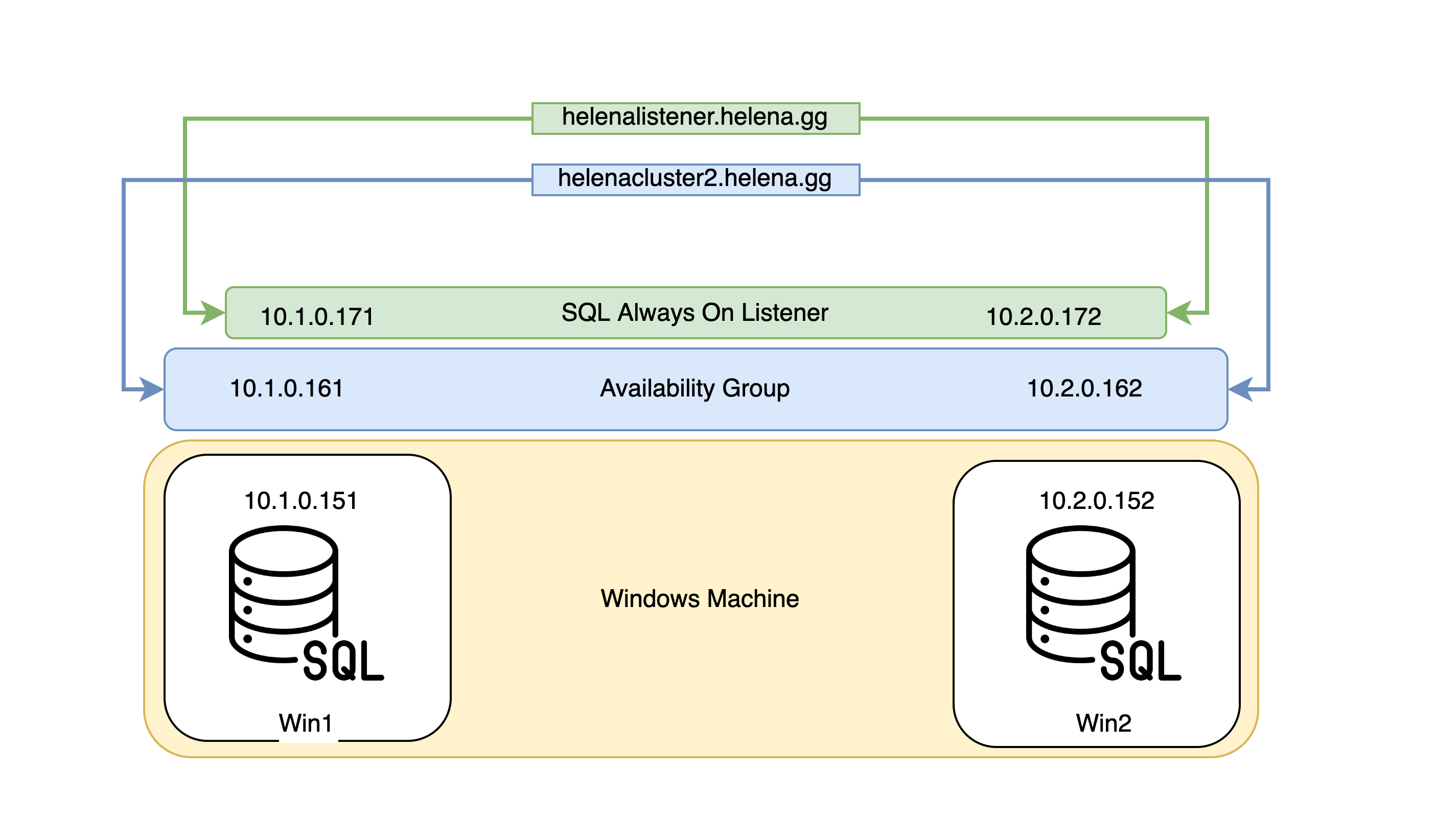 Here’s this deployment topology, where there will be 2 Windows Servers with SQL Server on Win1 and Win2, and we’ll create a load balancing Windows Availabilty Group Failover Cluster and also a load balancing SQL Always On Listener. These FQDNs will determine which IP Address is used based on their availability