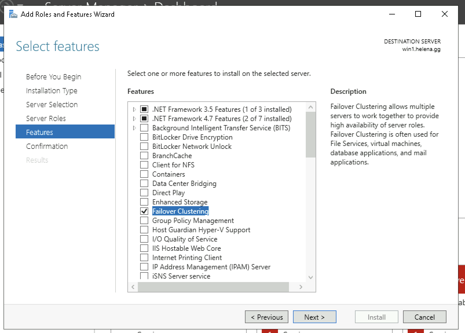 Then add the Failover Clustering on the Windows Server Manager on both servers