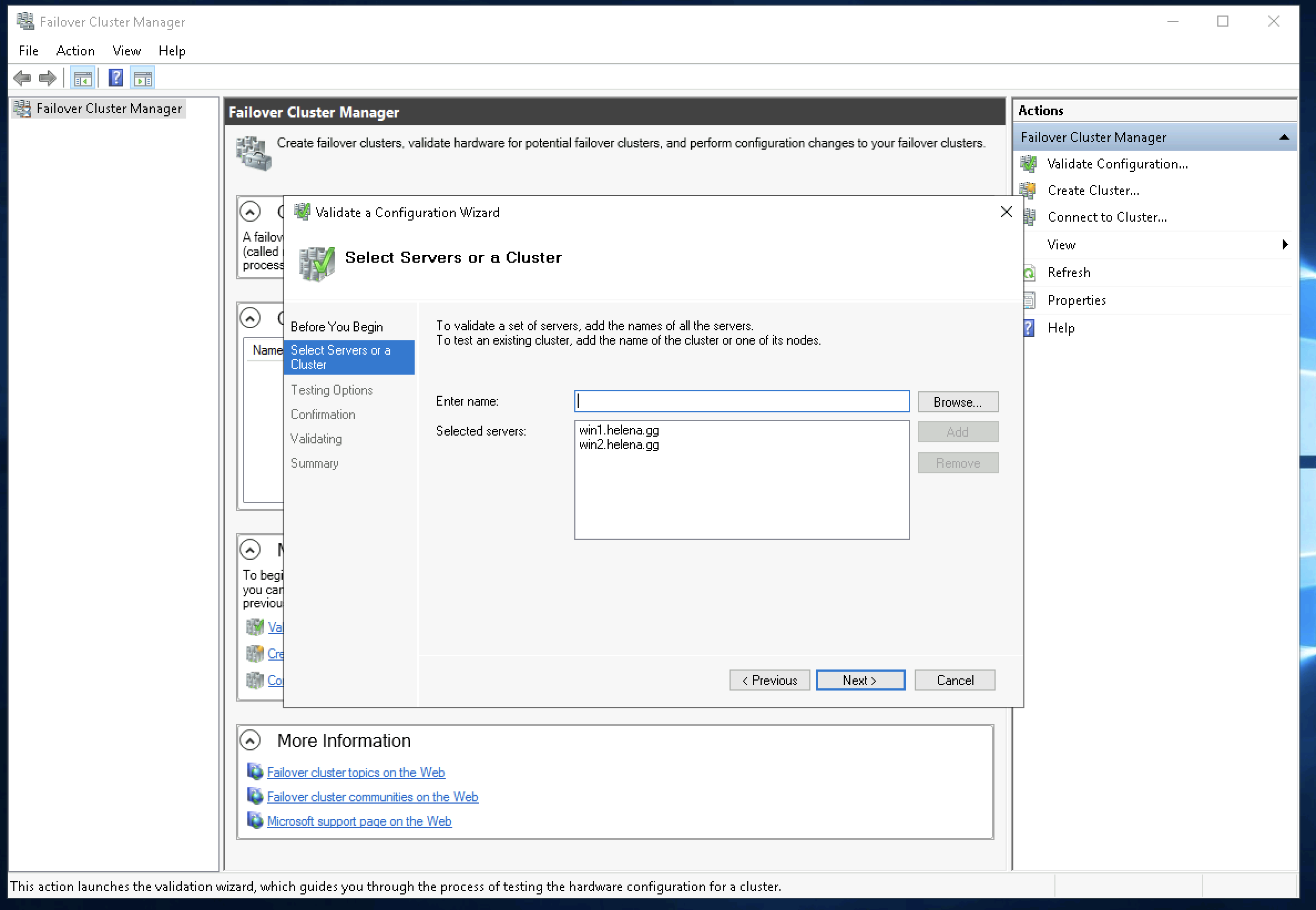 After that, on one of the server open Failover Cluster Manager, select Validate Configuration, and add the 2 servers