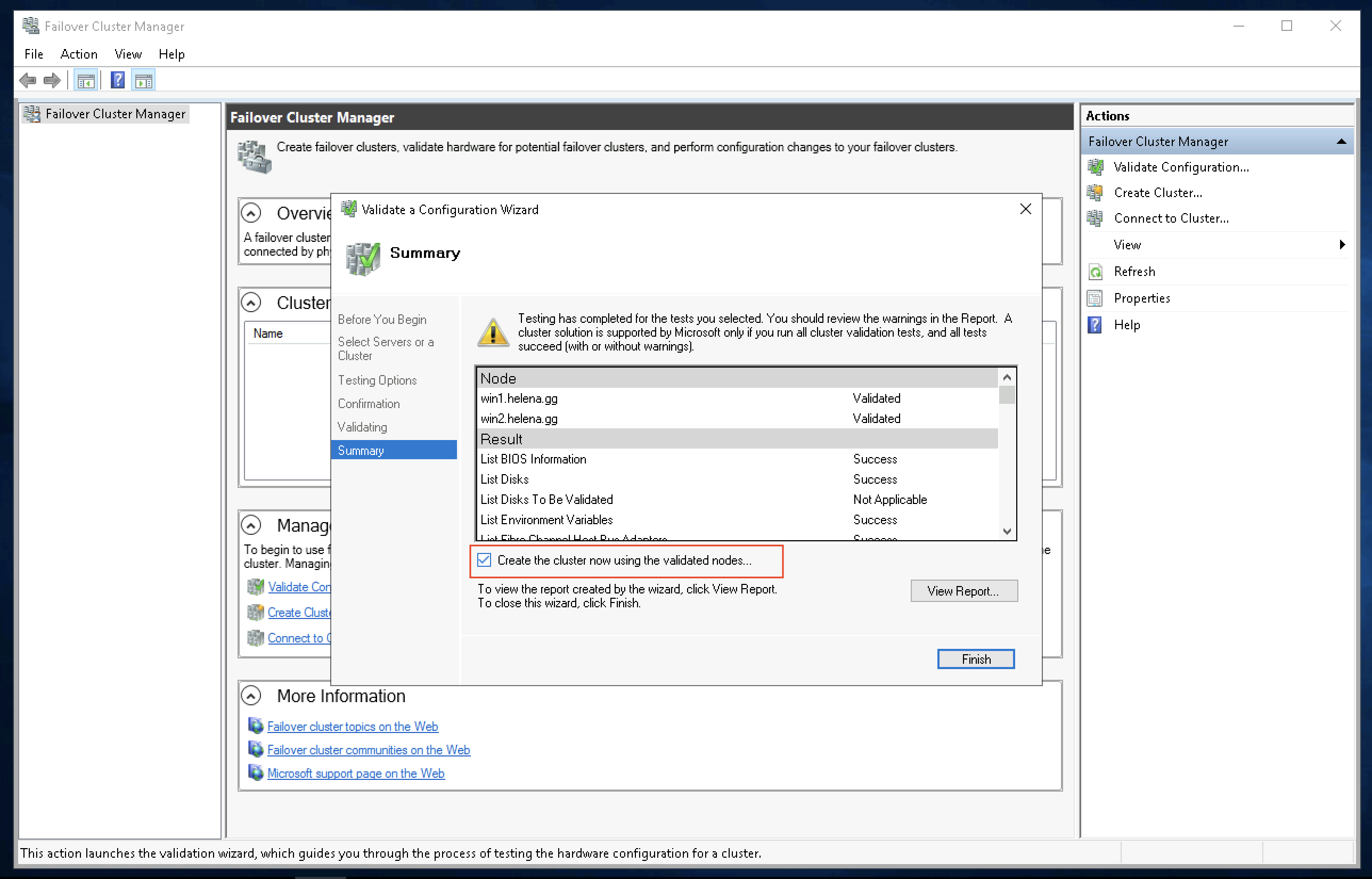 After the process finishes, check on “Create the cluster now … “ and select finish