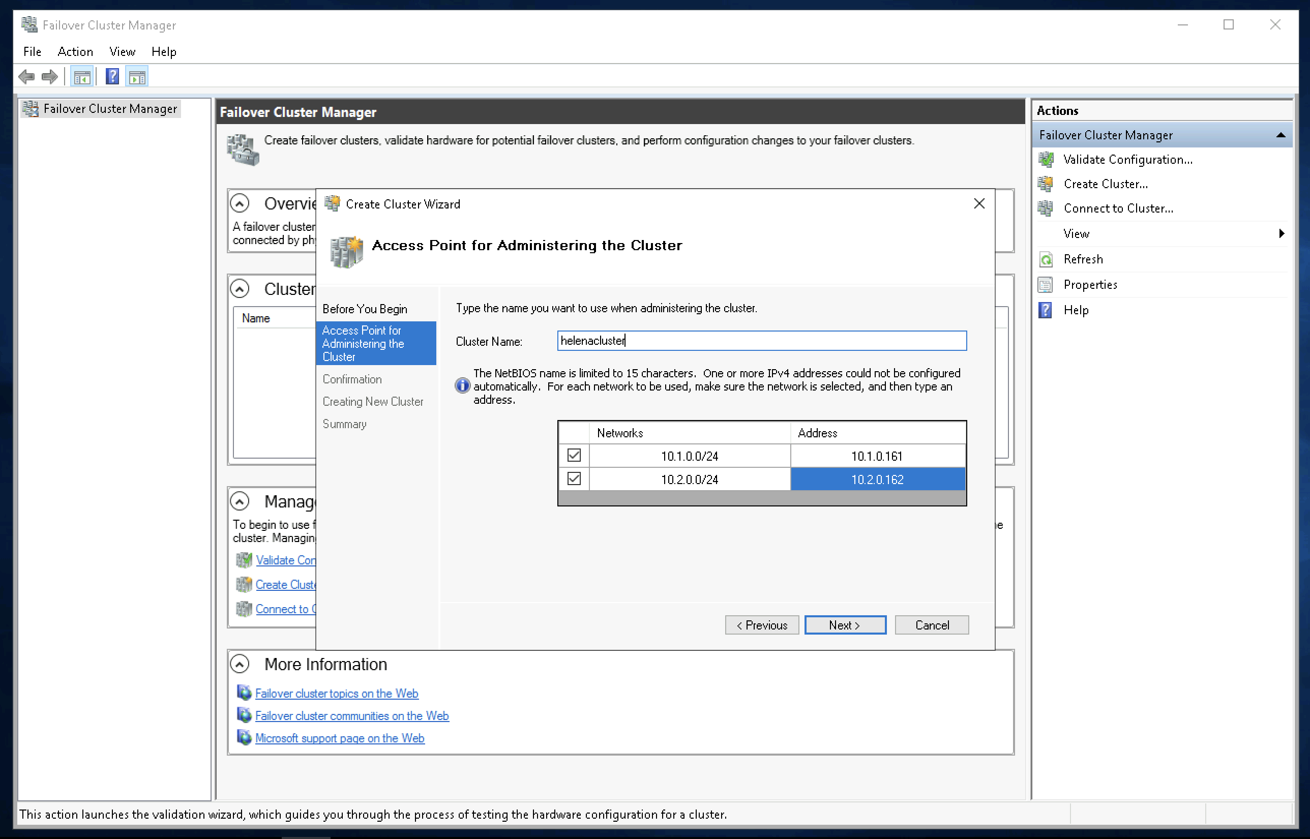 Now create the cluster name of “helenacluster2” and give each of them an IP Address