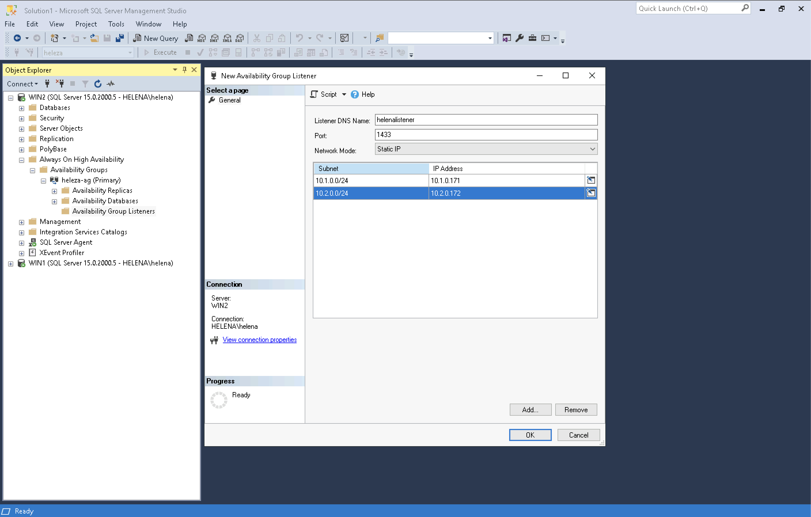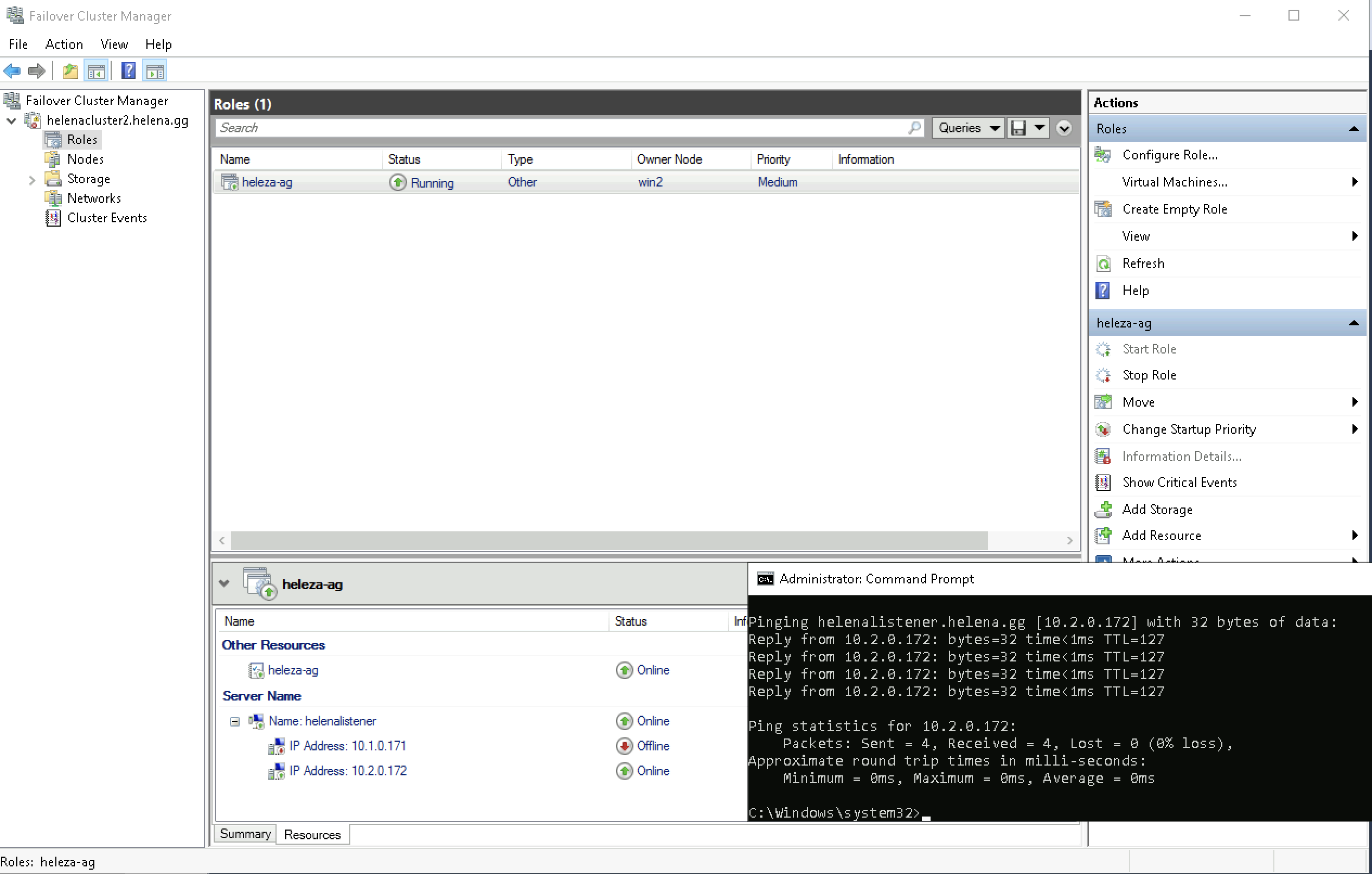 As we can see here, the active node now is Win2 and pinging helenalistener returns the IP Address of Win2