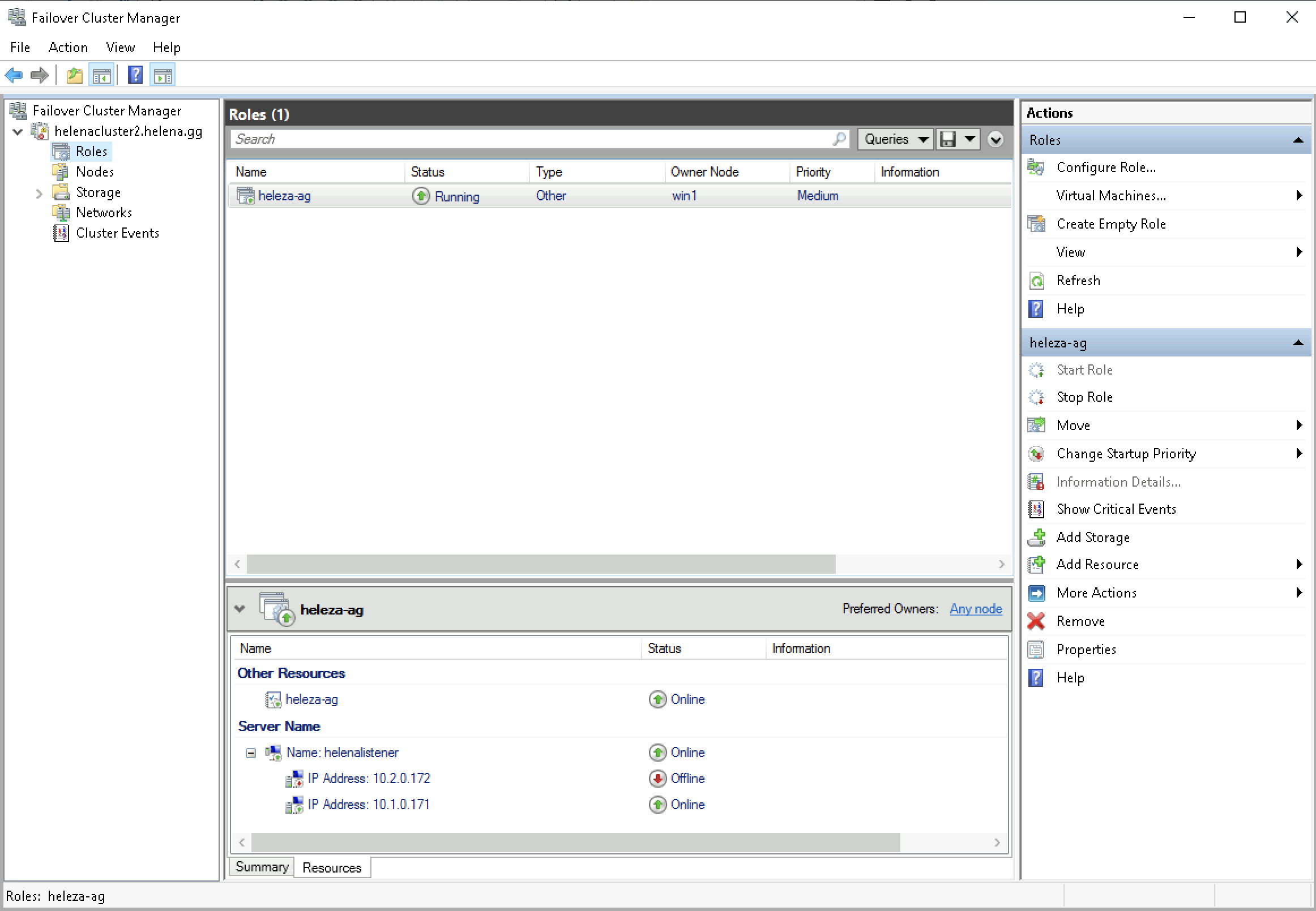 And thats about it. Now if we open the Failover Cluster Manager, we should see the SQL Always On Availablity Group on the roles tab