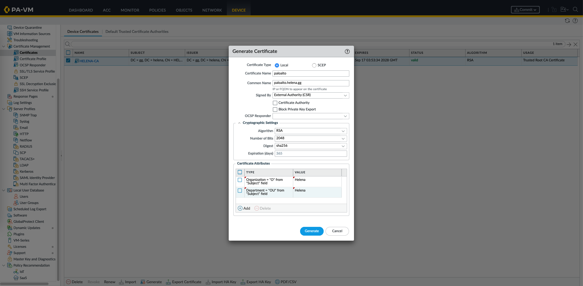 Next let’s generate a CSR for the Firewall, on the same page click Generate