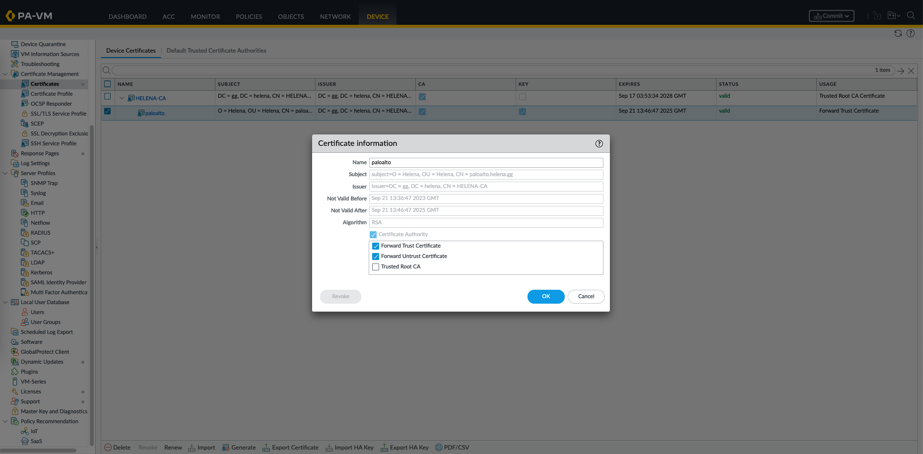 Select the paloalto cert, select “Forward Trust Certificate” and “Forward Untrust Certificate”