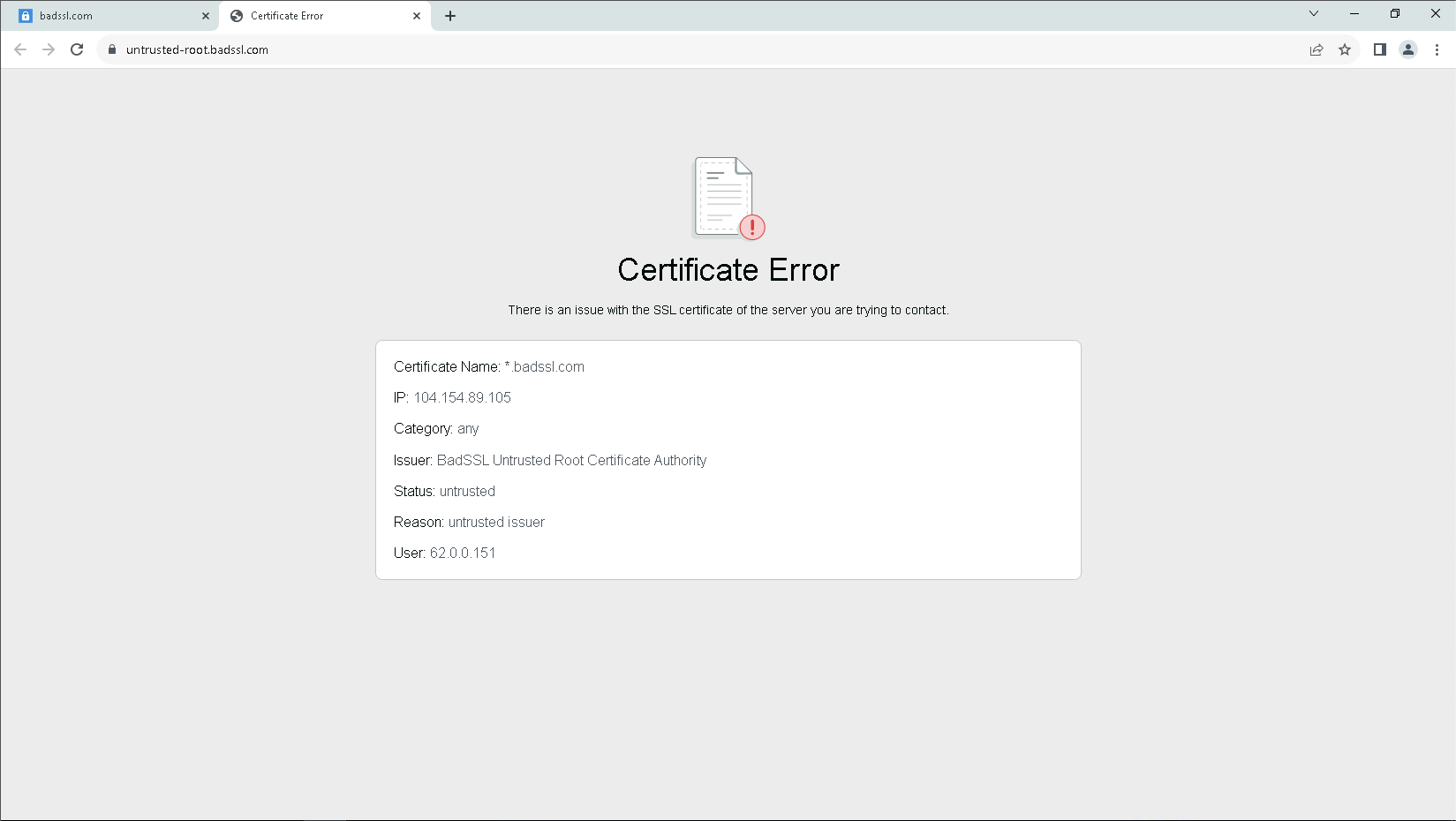 Now if we try accessing sites with bad certificate, we should see a warning not allowing the access
